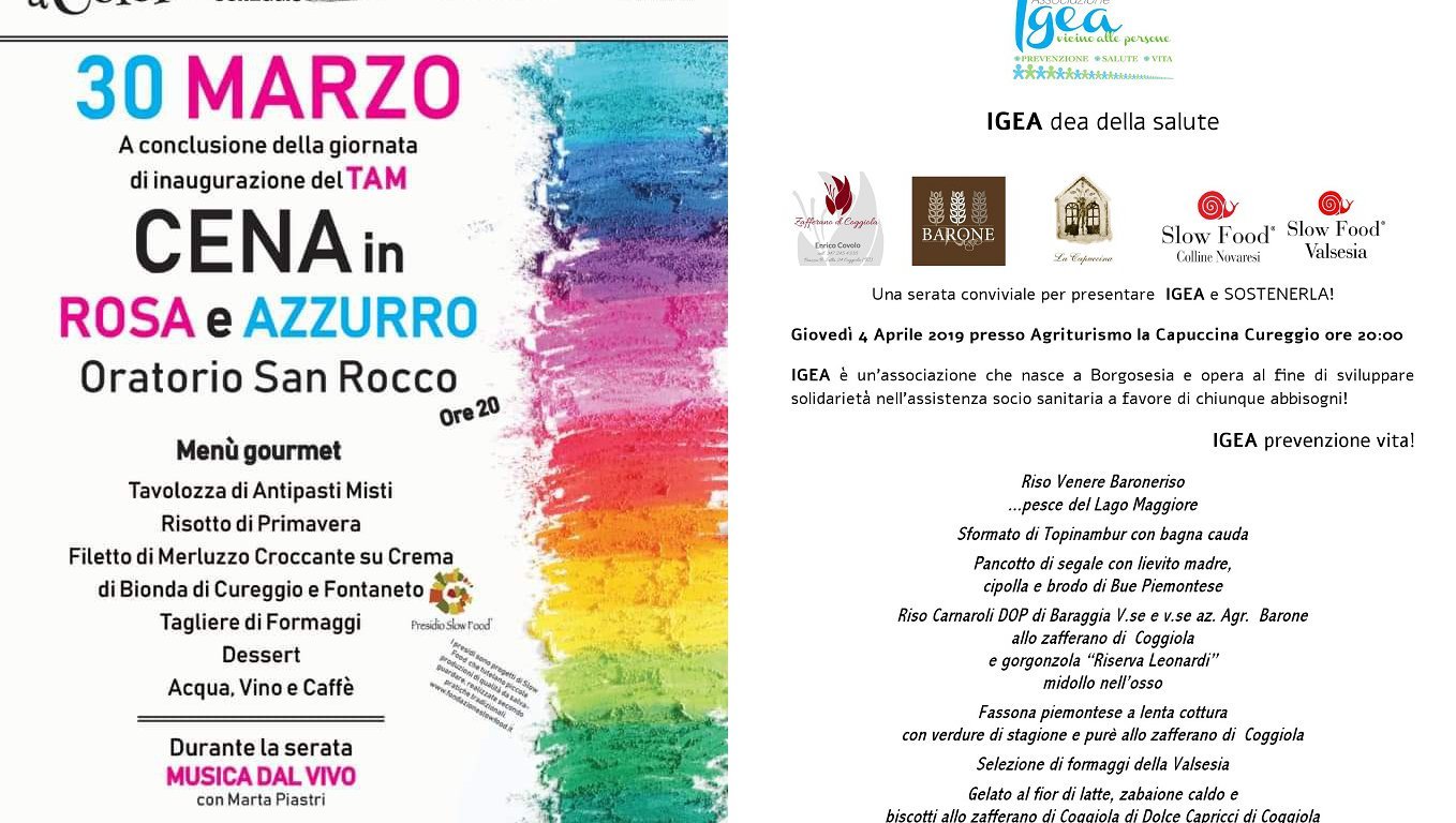 Sabato 30 marzo a Cureggio, nel contesto della rassegna Marzo a Colori, la Pro Loco di Cureggio, con il patrocinio del Comune e della nostra Condotta Slow Food, a conclusione della giornata di inaugurazione del TAM centro didattico e multimediale sul medioevo novarese, organizza una cena in rosa e azzurro con menu gourmet, presso l’oratorio San Rocco, a partire dalle ore 20.00.