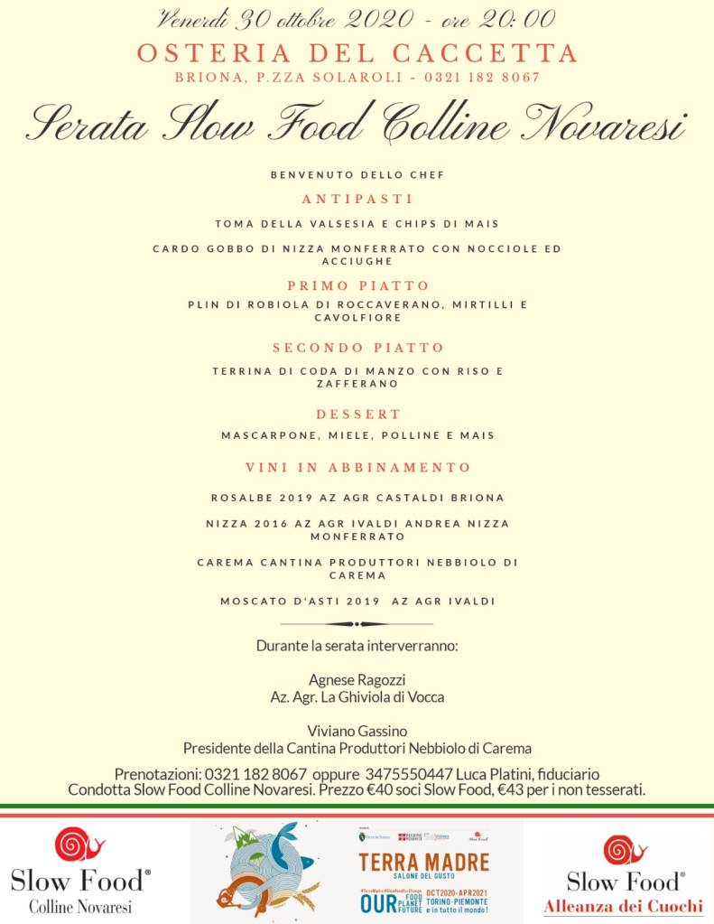 Venerdì 30 ottobre, con inizio alle ore 20.00, l’Osteria del Caccetta di Briona, insieme alla Condotta Slow Food Colline Novaresi, organizza una cena con presidi e prodotti sani e locali per festeggiare Terra Madre e l’ingresso del ristorante all’interno della grande famiglia dell’Alleanza dei Cuochi Slow Food. La cena è a numero chiuso su prenotazione, fino ad esaurimento posti.