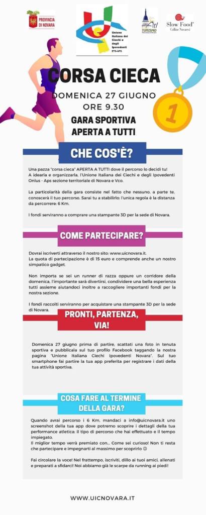 Domenica 27 giugno avrai occasione di farlo, grazie alla gara non competitiva aperta a tutti organizzata da Unione Italiana dei Ciechi e degli Ipovedenti Novara Onlus: 6 km da percorrere su un tracciato deciso da ciascun partecipante.