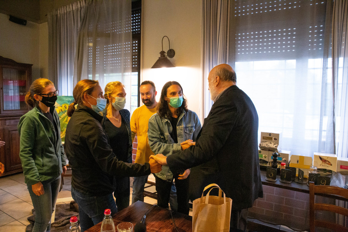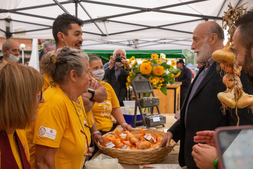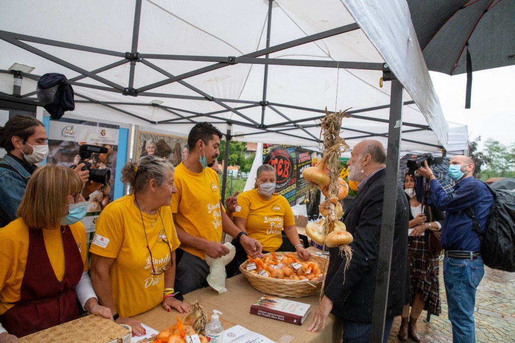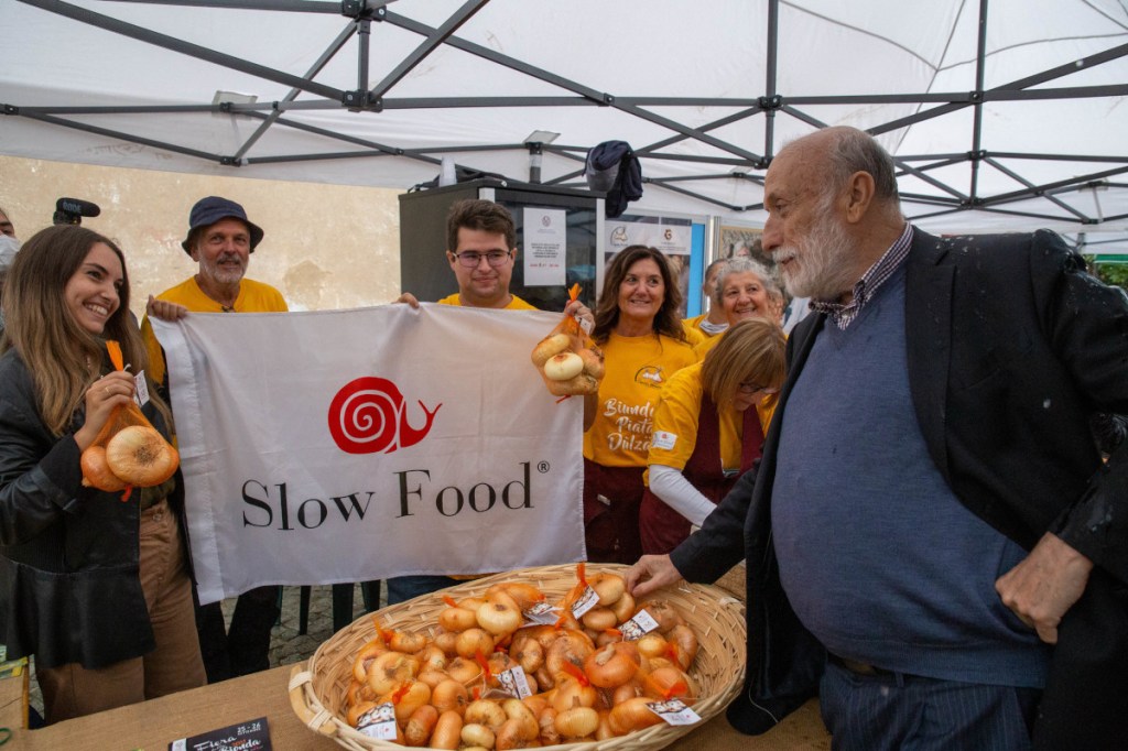 Poi il saluto al gruppo della Cipolla Bionda, dove ad attenderlo c’erano Oscar Temporiti, portavoce della Comunità Presidio della Cipolla Bionda, e Laura La Spada, fiduciaria della Condotta Slow Food di Chieti, che hanno dato vita a un gemellaggio tra condotte e cipolle presidio, dato che in Abruzzo ha casa la Cipolla Bianca di Fara Filiorum Petri.