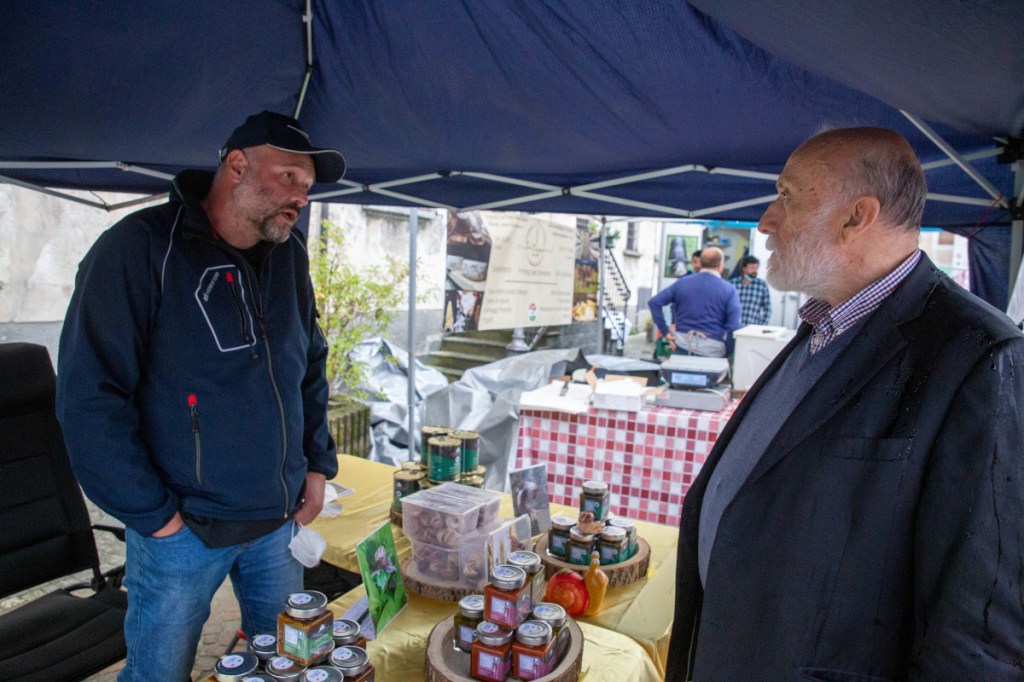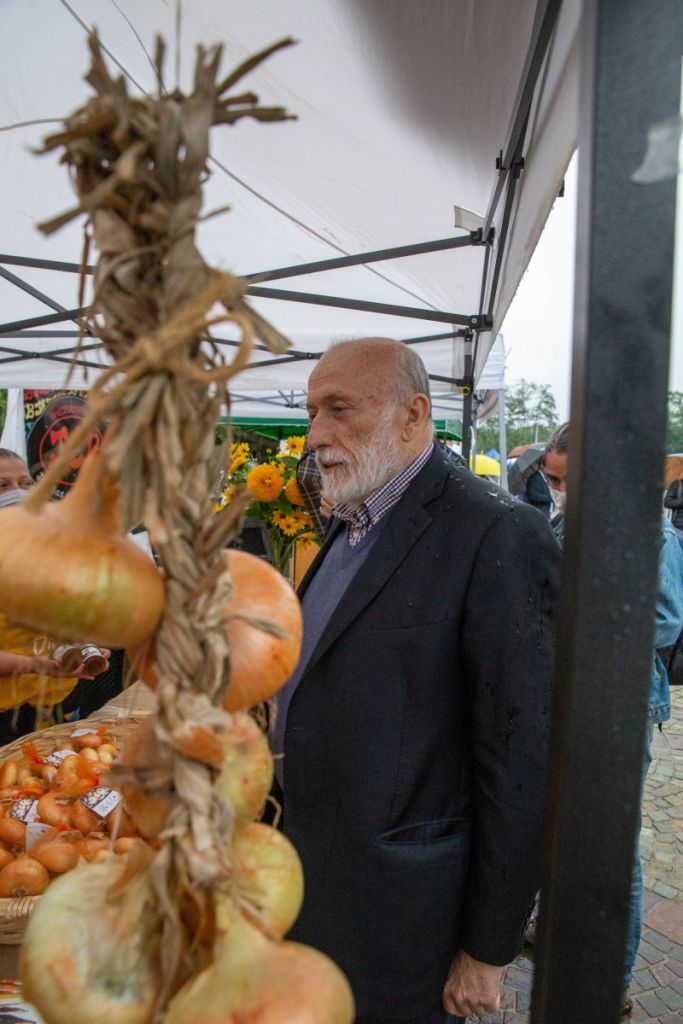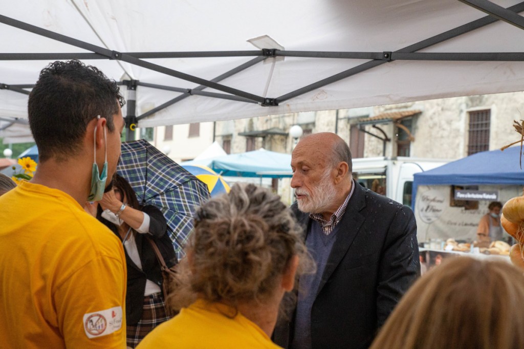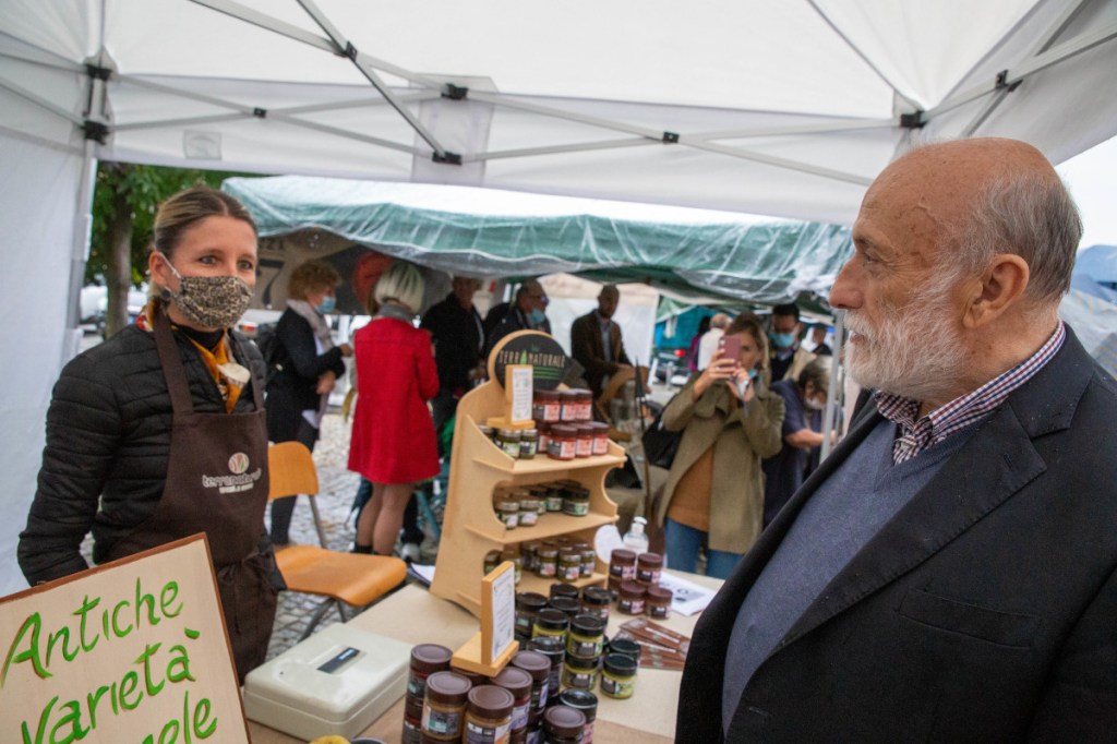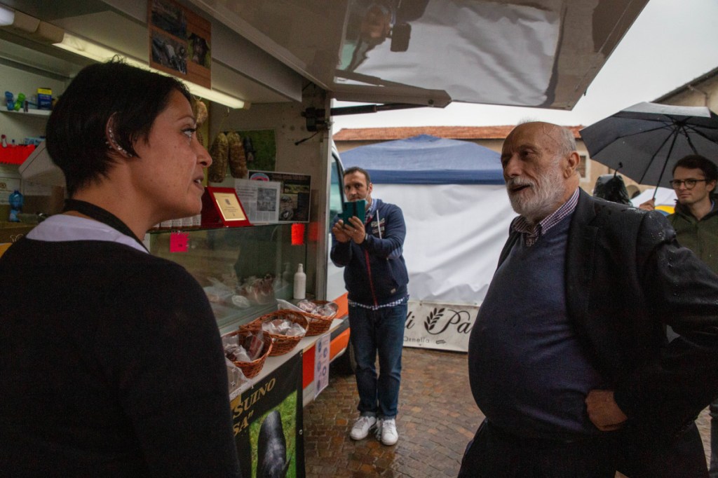 Il fondatore di Slow Food ha visitato lungamente il mercato contadino della fiera, seguito da un folto nugolo di curiosi, fermandosi a parlare con tutti i produttori, informandosi di ogni prodotto, chiedendo della loro storia.
