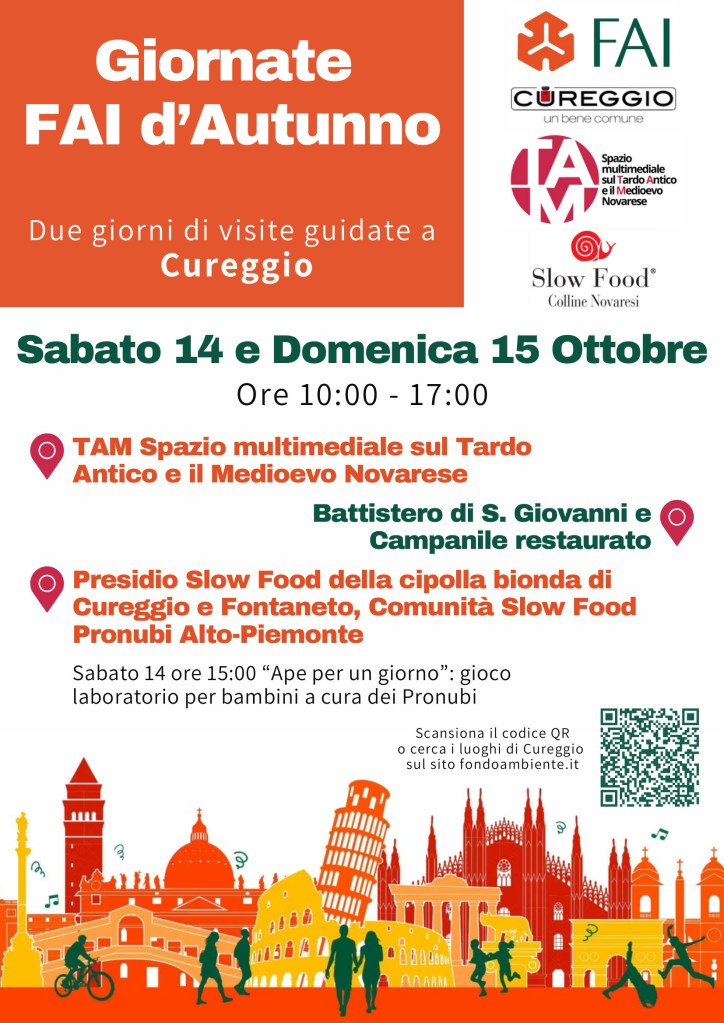 Il Gruppo FAI Colline Novaresi, con il patrocinio del Comune di Cureggio e della nostra Condotta Slow Food Colline Novaresi, organizza a Cureggio l’apertura di due differenti siti: il Battistero di San Giovanni Battista con il campanile recentemente restaurato e il TAM Spazio Multimediale sul Tardoantico e Medioevo novarese; oltre a questi luoghi, ci sarà l’opportunità di scoprire il presidio Slow Food della cipolla bionda di Cureggio e Fontaneto.