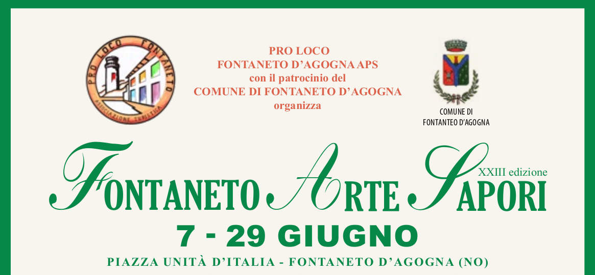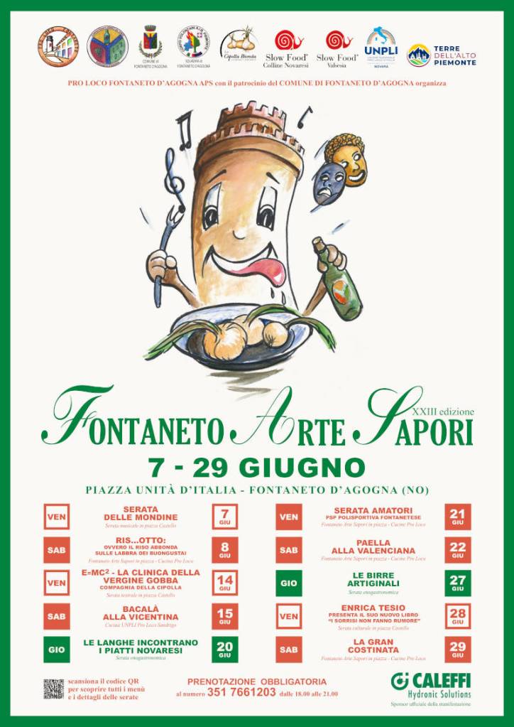 Come da tradizione ArteSapori aprirà l’estate fontanetese abbinando l’eccellenza dell’enogastronomia alla cultura e all’arte. Si inizia venerdì 7 giugno e si termina sabato 29 giugno. Un programma di dieci serate, così suddivise: due giovedì con serate enogastronomiche in collaborazione con chef della zona in Piazza Unità d’Italia, quattro sabato e un venerdì con serate popolari in piazza con cucina pro loco in Piazza Unità d’Italia, tre venerdì con serate culturali in Piazza Castello.