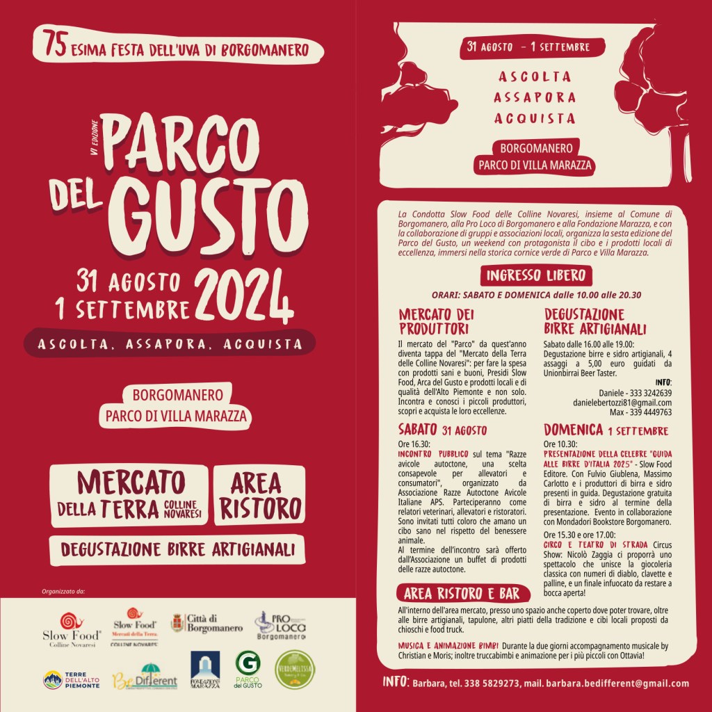 In occasione della 75esima Festa dell’Uva di Borgomanero, il Parco del Gusto giunge alla sua sesta edizione e come di consueto proporrà nel Parco di Villa Marazza, sabato 31 agosto e domenica 1 settembre, una ricca selezione del meglio del panorama regionale dei piccoli produttori e artigiani del cibo, per una squadra di 50 espositori che da quest’anno saranno anche Mercato della Terra delle Colline Novaresi, divenendo così una delle tappe di riferimento dei mercati di Slow Food in tutto il Piemonte.