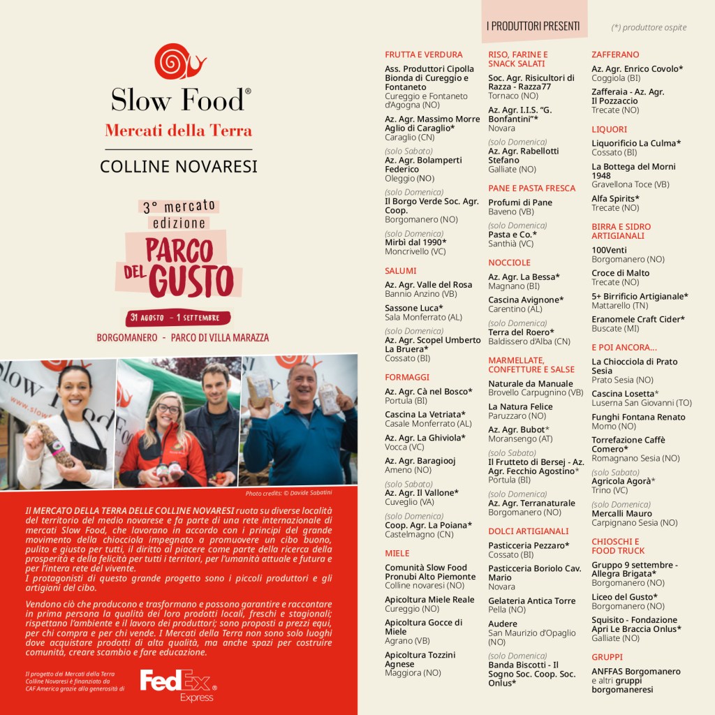 La manifestazione è organizzata dalla Condotta Slow Food Colline Novaresi, insieme al Comune di Borgomanero, alla Pro Loco di Borgomanero e alla Fondazione Marazza, con il patrocinio e il sostegno di ATL Novara, e porrà il centro dell’attenzione ancora una volta sul cibo locale, sulla promozione e valorizzazione delle eccellenze del territorio, sulla tutela della biodiversità e sul rispetto per l’ambiente.