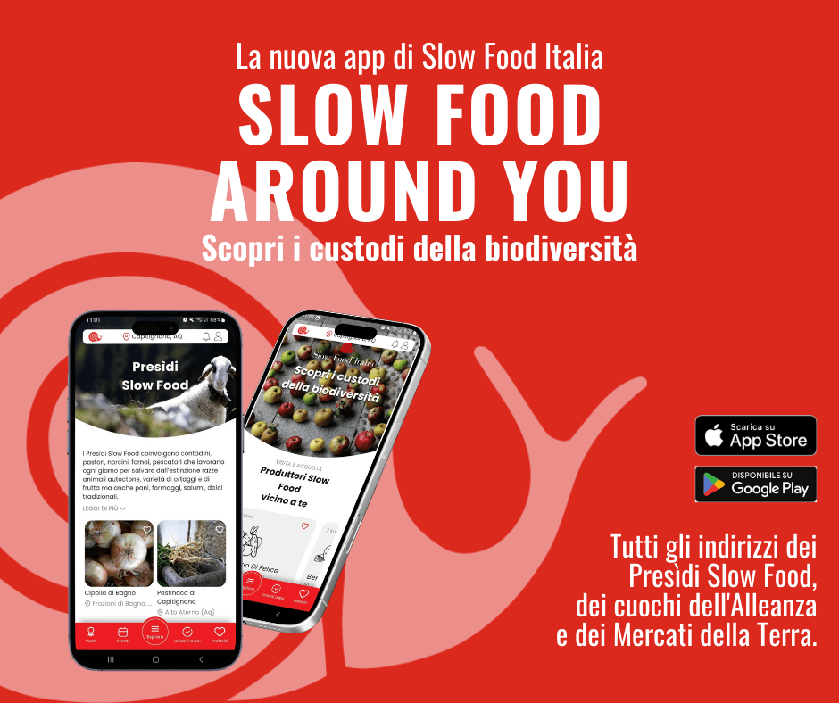 Scarica gratuitamente la app ufficiale di Slow Food Italia e vai a trovare i produttori direttamente in azienda o nel loro punto vendita. Assaggia i piatti dei cuochi che valorizzano i prodotti e le tradizioni gastronomiche acquistando direttamente dai produttori del loro territorio. Visita i Mercati della Terra, luoghi di incontro e apprendimento collettivo dove fare la tua spesa buona, pulita e giusta.