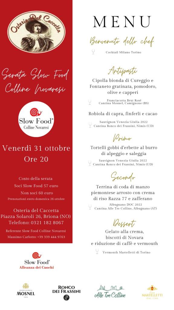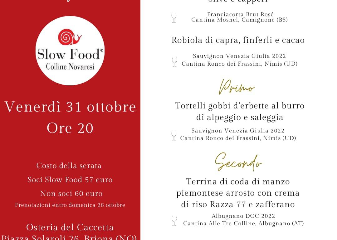 Torna venerdì 31 ottobre la Cena dell’Alleanza dei Cuochi di Slow Food, ospitata all’Osteria del Caccetta di Briona, in Piazza Solaroli 26.