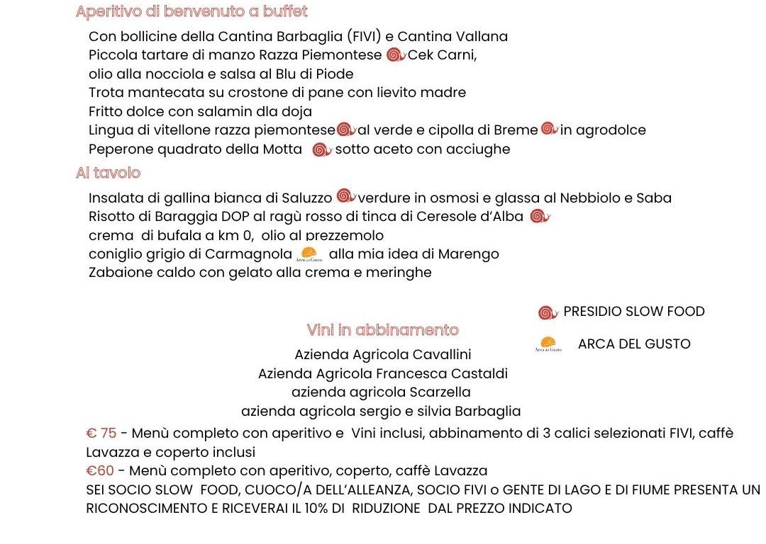 Soci Slow Food, Cuochi dell’Alleanza, soci FIVI o Gente di Lago e di Fiume presentando la tessera avranno il 10% di riduzione sul prezzo indicato.