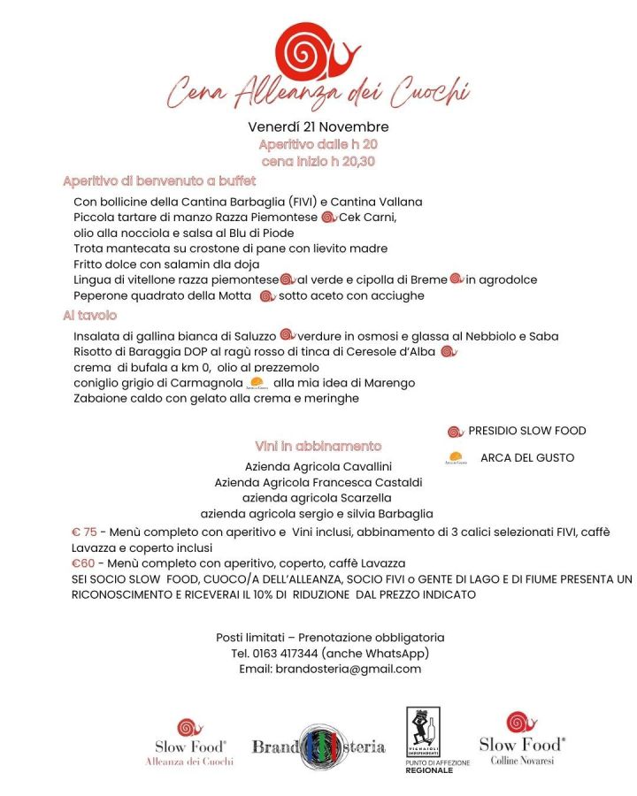 Venerdì 21 novembre a partire dalle ore 20.00, Brandosteria in via Massara 9 a Grignasco festeggia l’ingresso nell’Alleanza dei Cuochi Slow Food. Per l’occasione il locale propone una serata dedicata al gusto, alla biodiversità e alla convivialità: il Cuoco dell’Alleanza Slow Food, Matteo Brandoni, insieme ai produttori dei Presìdi, dell’Arca del Gusto e delle Comunità del Cibo, celebra il territorio con un percorso tra sapori autentici e stagionali.