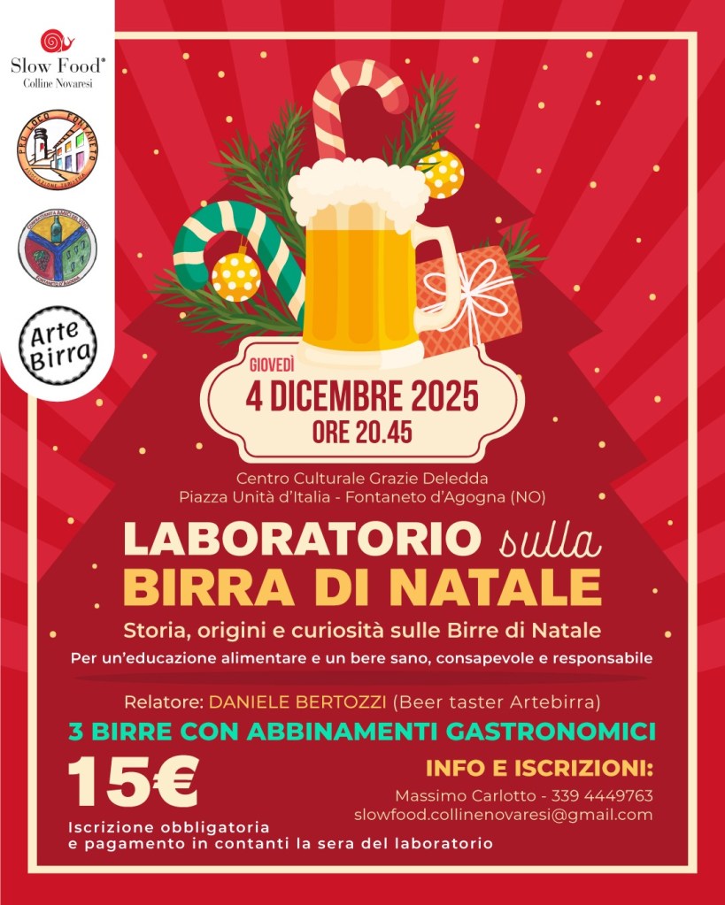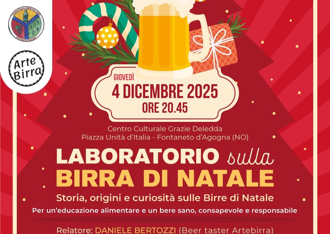 Con il Natale… arrivano le birre! Giovedì 4 dicembre a partire dalle ore 20.45, presso il Centro Culturale Grazia Deledda in Piazza Unità d’Italia a Fontaneto d’Agogna, è in programma un appuntamento brassicolo da non perdere, una serata per conoscere storia, origini e curiosità delle Birre di Natale, con degustazione guidata da Daniele Bertozzi (Beer Taster – Artebirra).