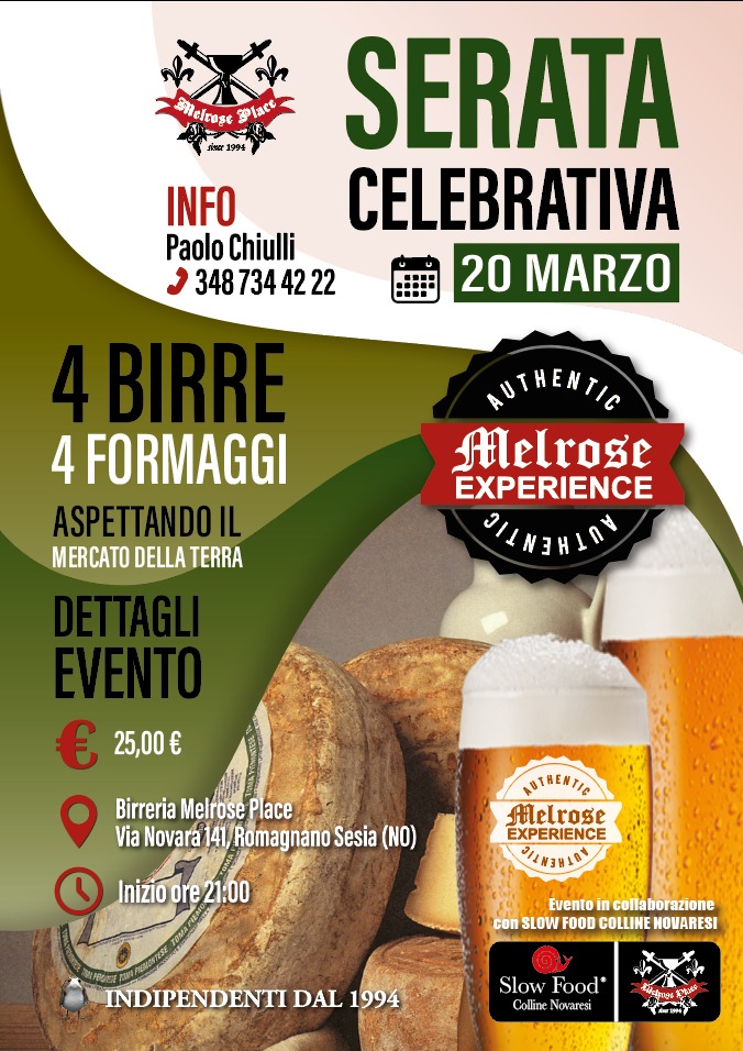 Venerdì 20 marzo, alle ore 21.00, presso “Melrose Place” in via Novara 141 a Romagnano Sesia si terrà una serata di degustazione guidata di 4 birre artigianali abbinate a 4 formaggi dell’Alto Piemonte. Costo 25.00 euro. Prenotazione obbligatoria al 348-7344222.