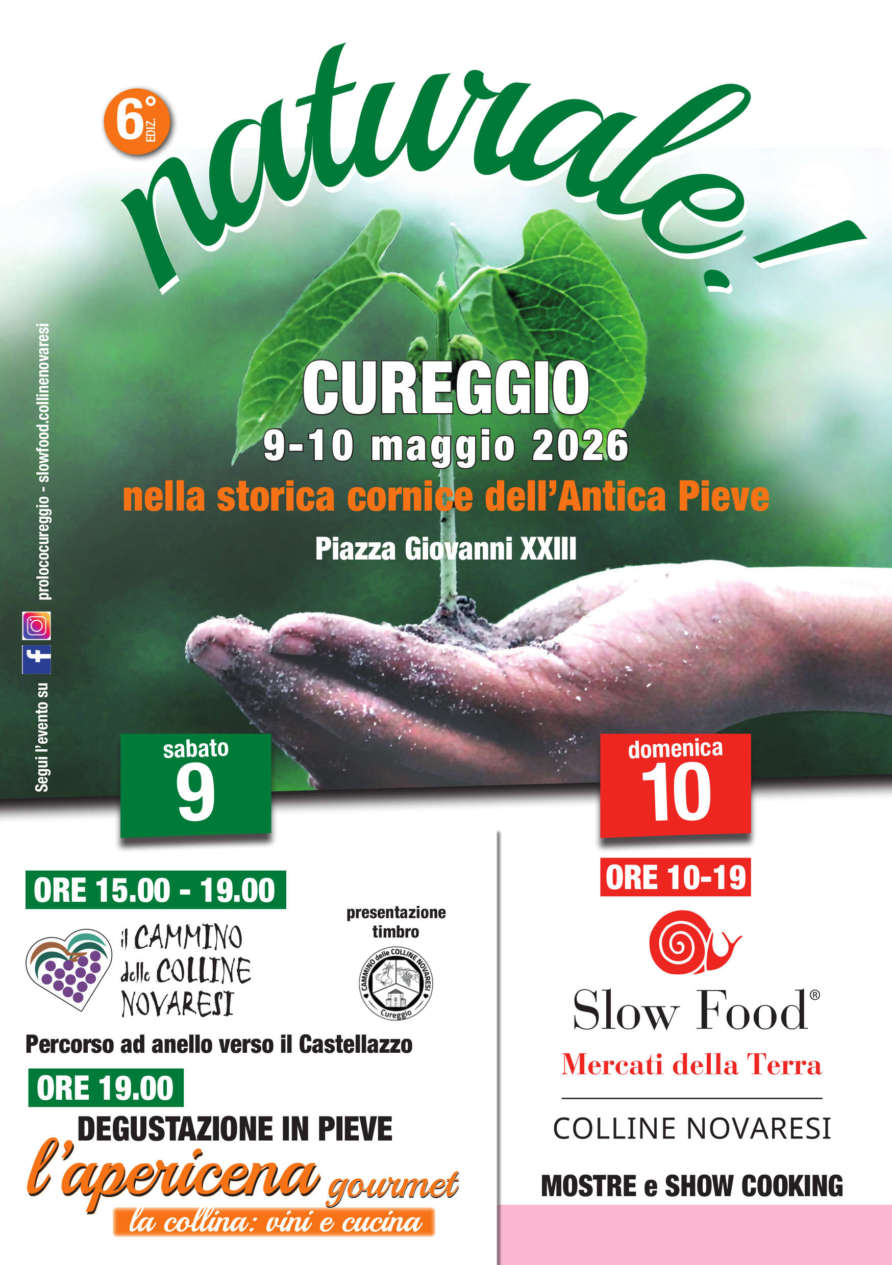 È in programma quest’anno sabato 9 e domenica 10 maggio Naturale! la manifestazione che si svolge in centro paese a Cureggio, incentrata sulla tutela della biodiversità e dei prodotti locali. L’Antica Pieve si anima proponendo due giornate di appuntamenti all’insegna della scoperta del territorio, della conoscenza, della degustazione e della spesa a km zero.