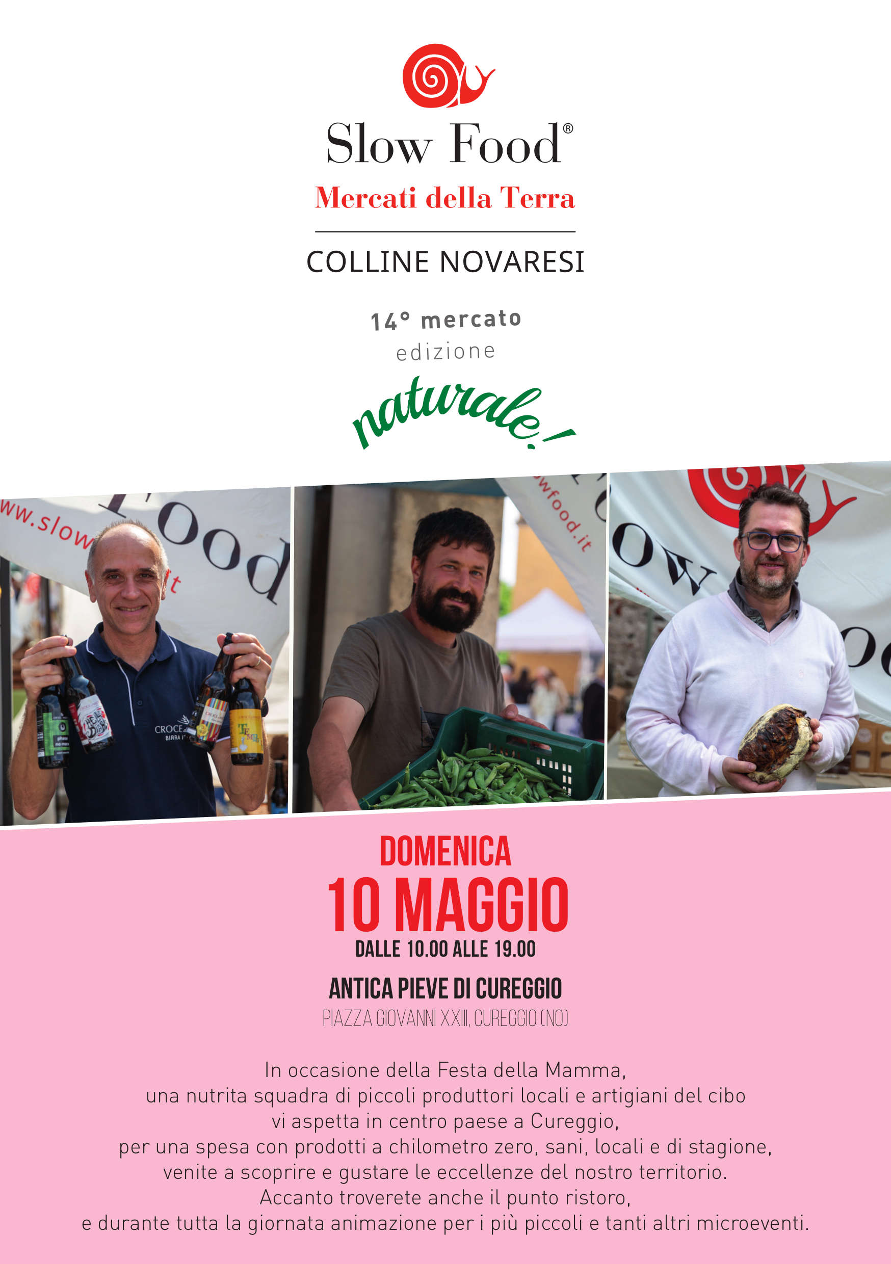 Si prosegue domenica 10 maggio invece, dalle ore 10.00 alle 19.00, con il Mercato della Terra delle Colline Novaresi nella storica cornice dell’Antica Pieve in Piazza Giovanni XXIII: una nutrita squadra di piccoli produttori locali e artigiani del cibo vi aspetta in centro paese a Cureggio, per una spesa con prodotti a chilometro zero, sani, locali e di stagione, venite a scoprire e gustare le eccellenze del nostro territorio.