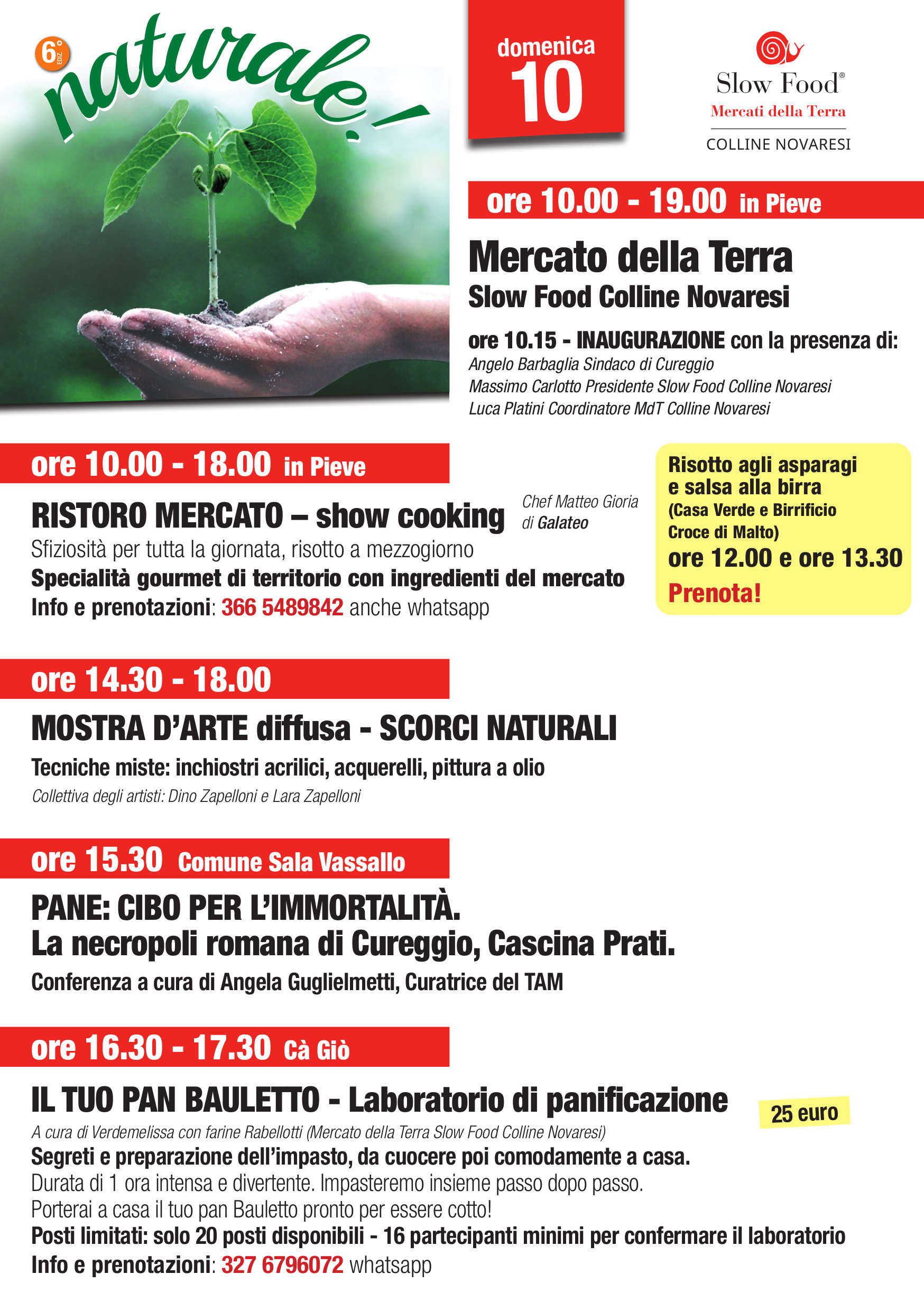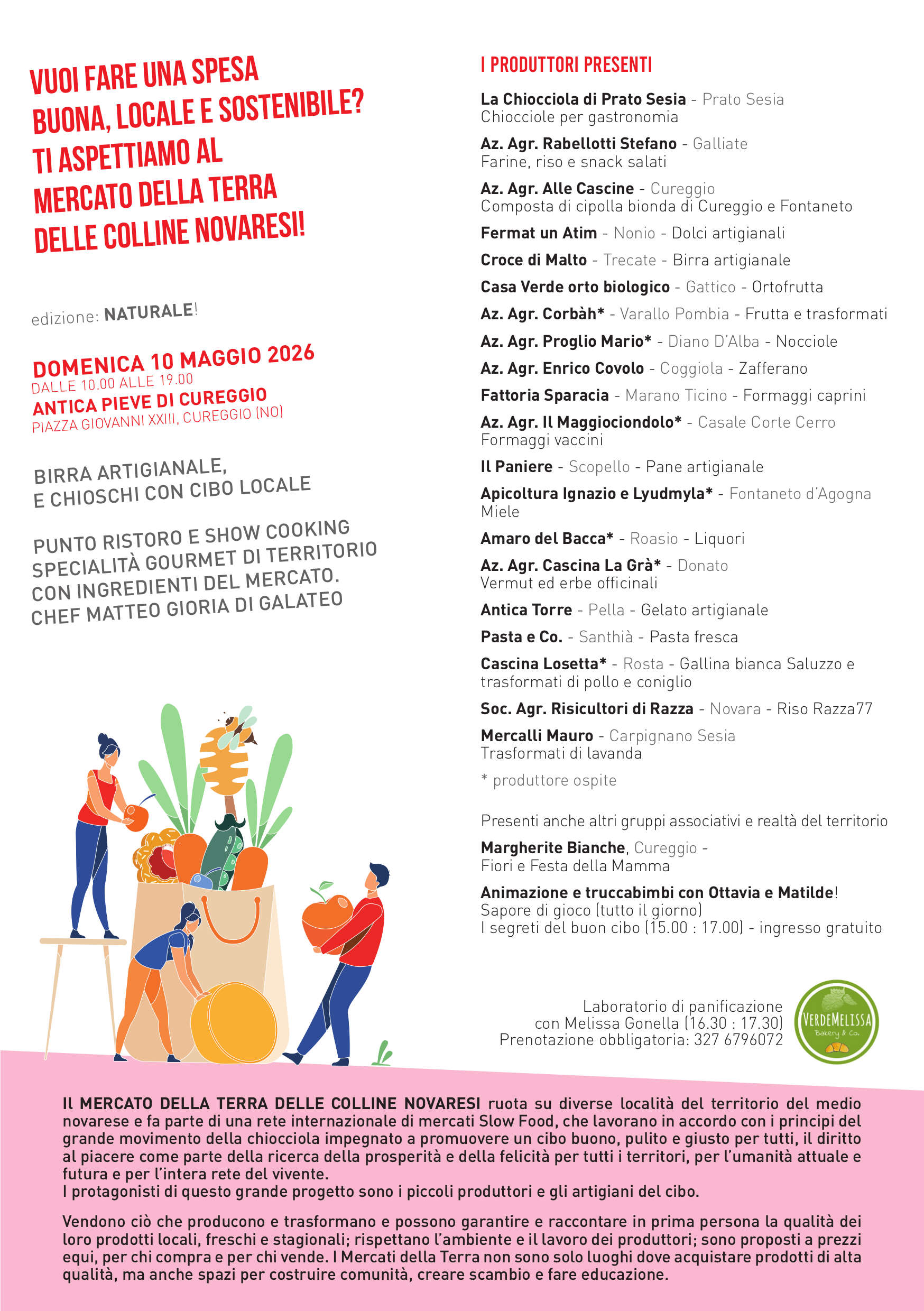 IL TUO PAN BAULETTO – Laboratorio di panificazione, a cura di Verdemelissa con farine Rabellotti (Mercato della Terra Slow Food Colline Novaresi). Segreti e preparazione dell’impasto, da cuocere poi comodamente a casa. Durata di 1 ora intensa e divertente. Impasteremo insieme passo dopo passo. Porterai a casa il tuo pan Bauletto pronto per essere cotto! Posti limitati: solo 20 posti disponibili – 16 partecipanti minimi per confermare il laboratorio. Costo di partecipazione 25 euro. Info e prenotazioni: 327 6796072 Whatsapp.