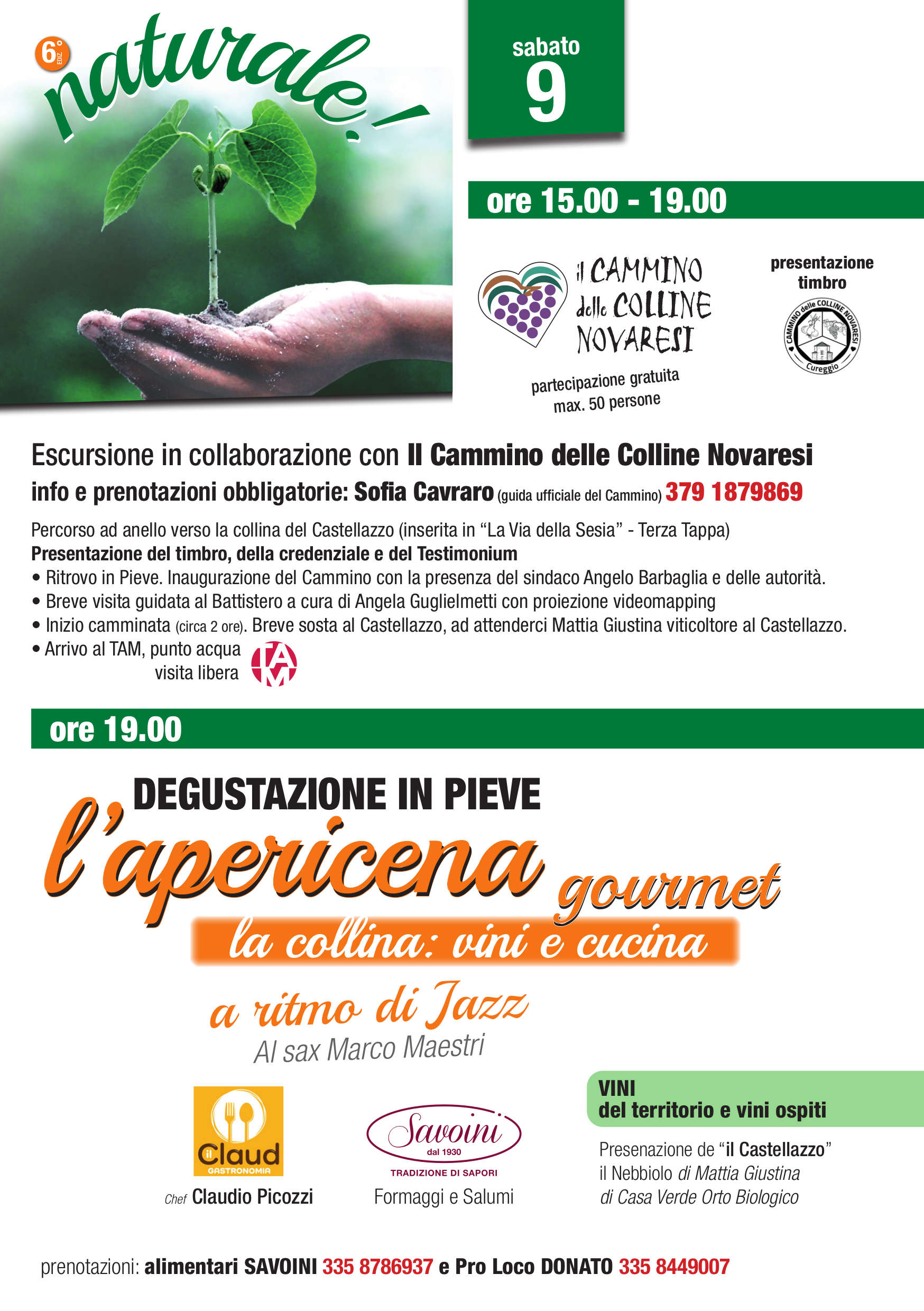 Apericena gourmet sul tema la collina vini e cucina, al ritmo di jazz con al sax Marco Maestri. In collaborazione con Chef Claudio Picozzi del Claud e Umberto Savoini. Presentazione de “il Castellazzo”, il Nebbiolo di Mattia Giustina di Casa Verde Orto Biologico.