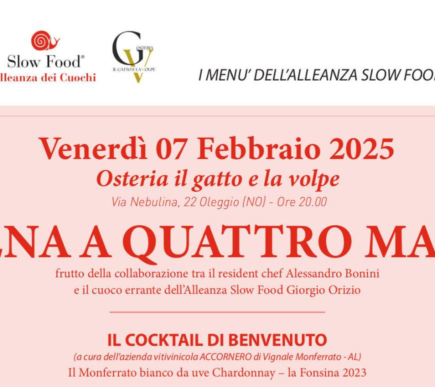Ormai è diventato un classico: l’ultimo venerdì di ottobre, quest’anno il 27, ci ritroviamo presso l’Osteria del Caccetta a Briona per la tradizionale cena annuale dell’Alleanza dei Cuochi Slow Food. Il ristorante infatti aderisce al progetto internazionale della chiocciola che vede impegnati cuochi e ristoratori di tutto il mondo per dare rilievo e visibilità al lavoro dei produttori dei presidi e dei piccoli produttori locali, … Continua a leggere Appuntamento il 27 ottobre all’Osteria del Caccetta: torna la Cena dell’Alleanza dei Cuochi